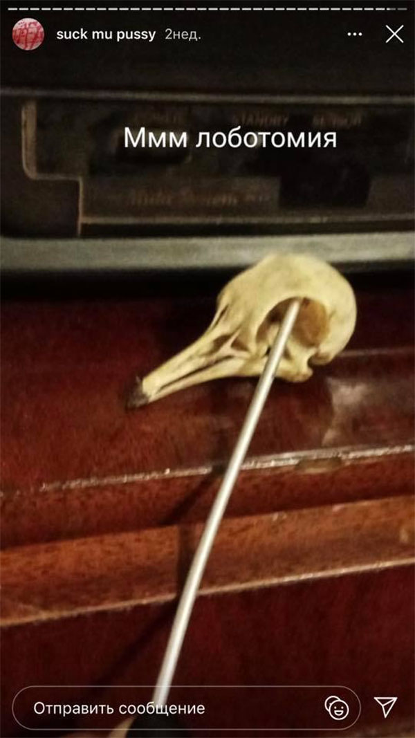 При просмотре других аккаунтов 15-летнего подростка в соцсетях волонтеры обнаружили и фото черепа мертвой птицы с подписью «Ммм лоботомия».