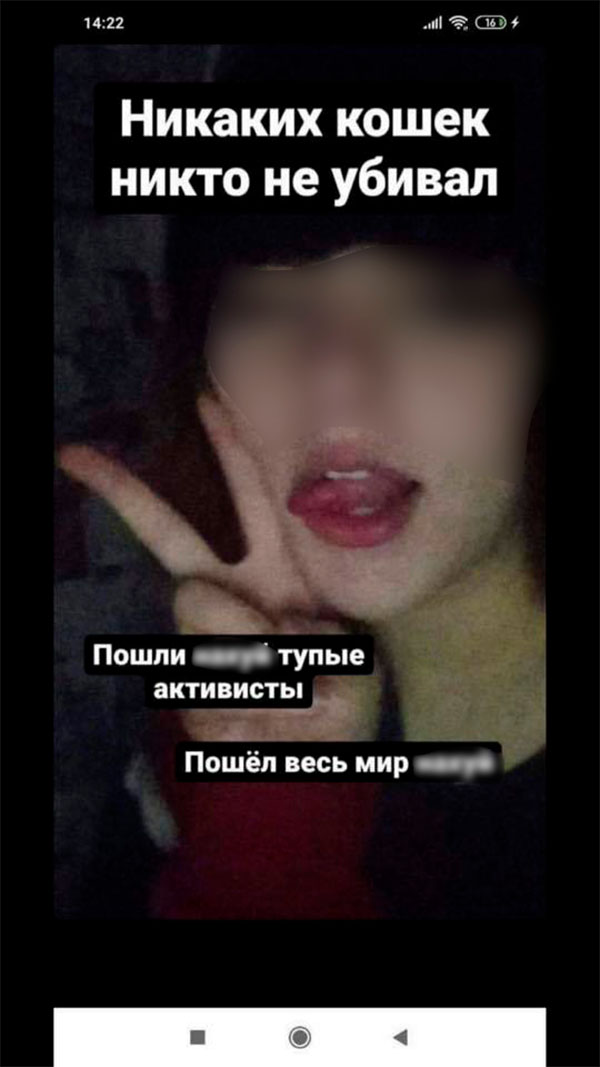 В Днепре ученица 9 класса спровоцировала скандал, опубликовав в соцсети фото с головой кота… на ноже. «Кис-кис, мяу-мяу, я от тебя офи*еваю», — гласит подпись к снимку.