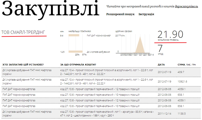 В торгах выигрывали две фирмы: “Смайл-трейдинг” и “Смайл сервис”. Они победили на конкурсах “Черноморнефтегаза” и “Укргазвыдобування” – на тот момент они были дочерними предприятиями НАК “Нафтогаз Украины”. Компании из группы “Смайл”, занимающиеся страховой деятельностью, поставили сотни тонн проката, арматуры и других металлургической продукции.