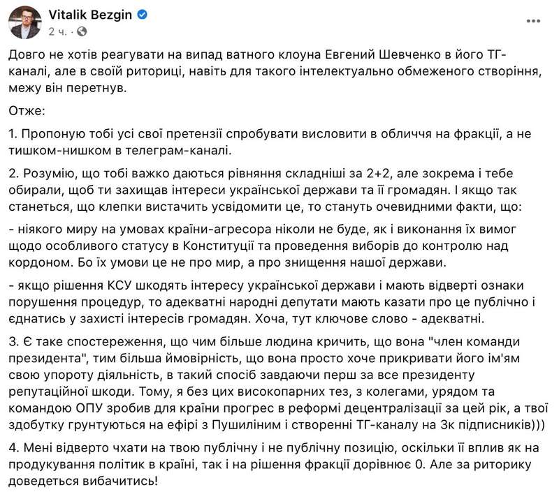 Конфликт начался после того, как нардеп Шевченко в своем Telegram-канале опубликовал сообщение, в котором назвал критиков решения КС “адептами Госдепа”, а политика Безгина – ярким представителем этой группы, “безмозглым” и “убогим существом”.