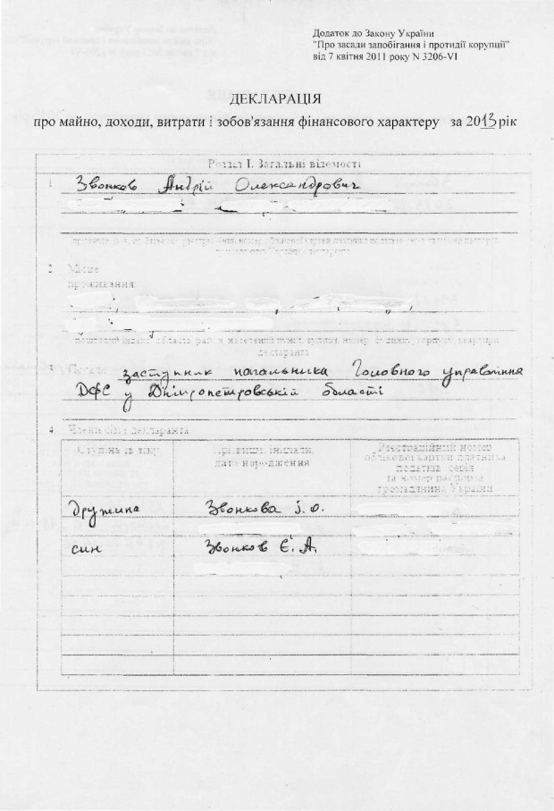 В редакцию «Лиц» обратилась руководитель Люстрационного комитета Кременчуга Ольга Тищенко. Активистка подозревает заместителя начальника Главного управления Государственной фискальной службы Украины в Днепропетровской области (другими словами, – налоговой) Андрея Звонкова в коррупции. Ранее он работал начальником налоговой инспекции в Кременчуге. По информации активистки, Звонков покупает дорогие автомобили и квартиры, несмотря на относительно скромную зарплату чиновника. Его жена Ирина является собственницей ресторанов и комплексов для отдыха. Ирина зарабатывает больше, чем муж – ее доход за год превышает 1 миллион.
