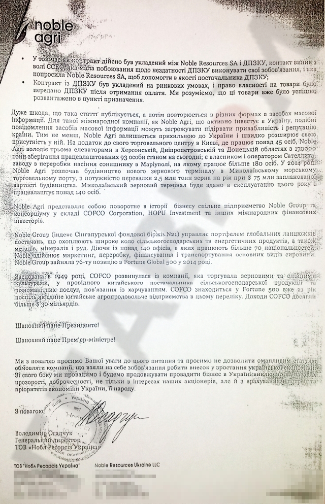 Тем временем группа, как стало известно «Главкому», Noble Agri (в которую входит и упомянутая выше Noble Resources) оказавшись в центре громкого скандала, попыталась его быстро замять. Торговцы зерном решили не искать сложных путей и написали оправдательное письмо прямо президенту Порошенко и премьер-министру Яценюку. Руководителей страны призвали не верить сообщениям СМИ о том, что компания связана с депутатами, которых уличили в аграрном лоббизме. Более того, бизнесмены решили убедить президента и премьера в том, что это сами китайцы в буквальном смысле просили их помочь государству Украина выполнить важный контракт.