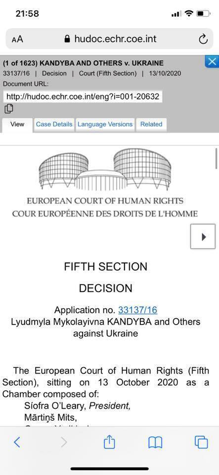 Заявители жаловались на нарушение их права на собственность и права на справедливый суд. Суд своим решением признал неприемлемым заявление по делу Kandyba and Others v. Ukraine, no. 33137/16.