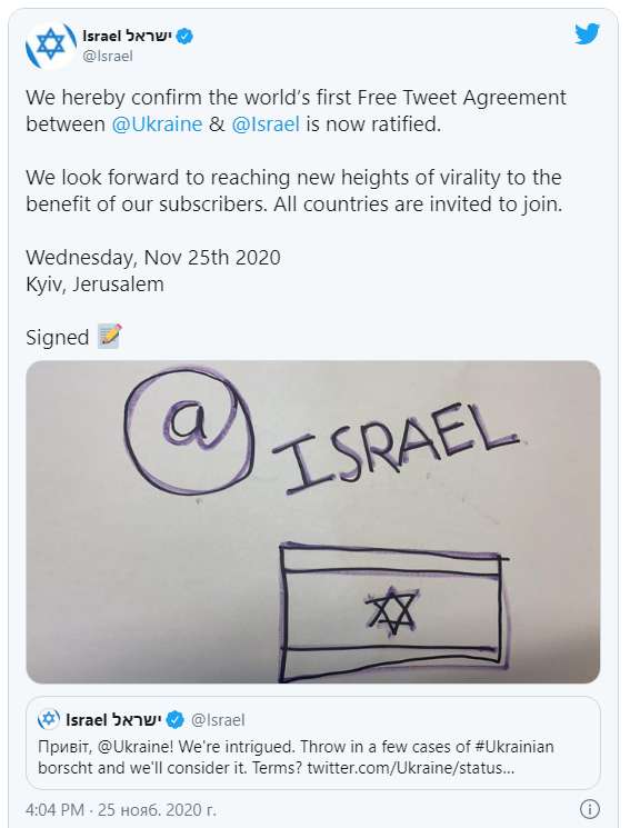 Официальные Twitter-аккаунты государства Израиль и Украины в среду, 25 ноября, заключили первое "соглашение" в соцсети.