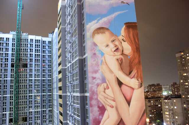 На недавно построенной многоэтажке, расположенной рядом со станцией метро "Харьковская", изображена женщина с младенцем на руках. Художники трудились над гиганским изображением более трех недель. Авторы проекта заявляют, что этот мурал является самым высоким в Европе.