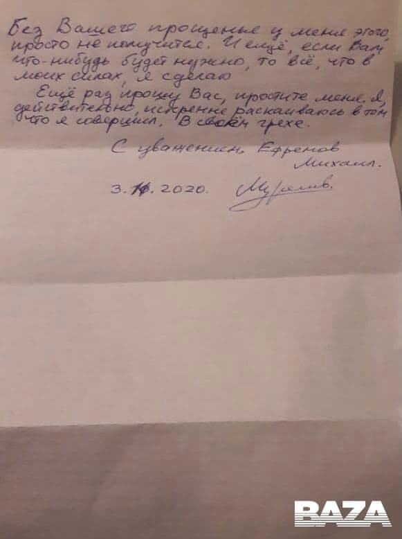 Актер Михаил Ефремов, приговоренный к восьми годам колонии за смертельное ДТП, написал письмо вдове погибшего в аварии Сергея Захарова, просив у нее прощения.