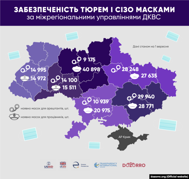 За інформацією правозахисників, у місцях позбавлення волі є гострий дефіцит масок і дезінфекторів. Здебільшого засобами індивідуального захисту забезпечені лише працівники установ та медичних персонал.