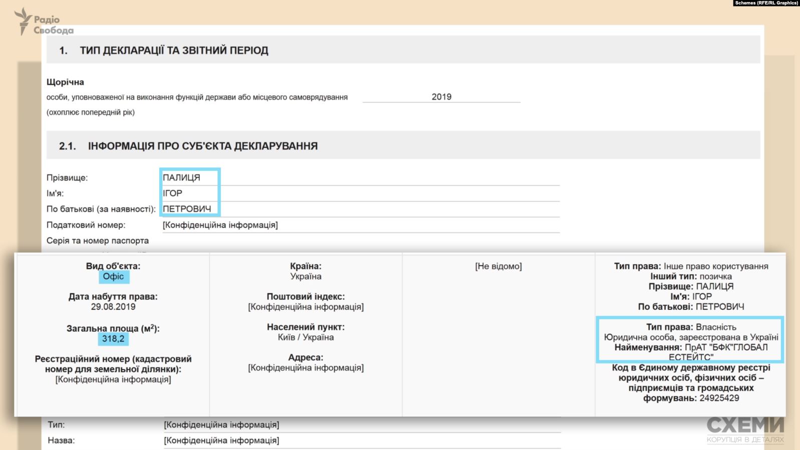 Соратник Констанкевич і Батенко по групі «За майбутнє» та давній бізнес-партнер Коломойського Ігор Палиця, який вказав приймальнею увесь 5 поверх бізнес-центру «Міленіум», у декларації за 2019 рік зазначив, що майже 320 квадратних метрів офісної площі отримав від фірми «Глобал Естейтс».