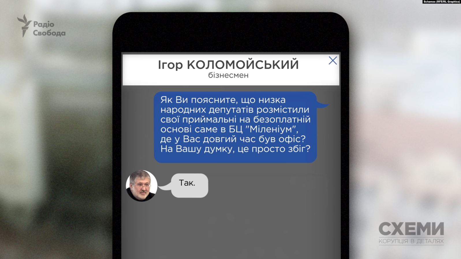 У коментарі журналістам Ігор Коломойський повідомив, що будівля бізнес-центру йому не належить і офісу там він вже немає. А на уточнення, як він може пояснити, що низка депутатів отримали безоплатно квадратні метри у «Міленіумі», відповів, що це «збіг».
