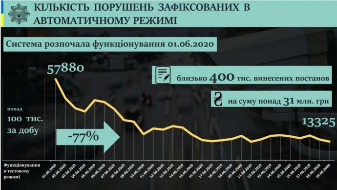 Якщо в перший день роботи система зафіксувала понад 57 тис порушень, то вже за тиждень їх кількість зменшилася на третину. За перший місяць роботи камер статистика перевищень швидкості продовжувала зменшуватися і в кінці червня становила 13,3 тис.