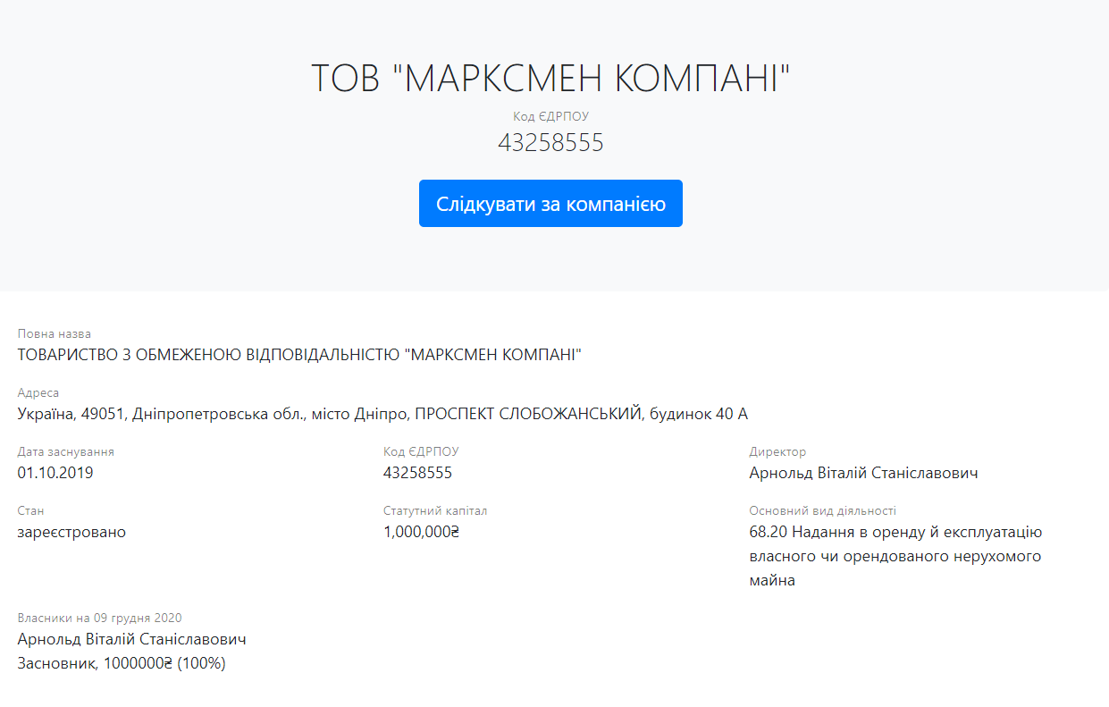 Товариство з обмеженою відповідальністю - «Марксмен компані» - було засноване незадовго до рейдерського захоплення. На той час його статутний капітал становив одну тисячу гривень. Її власник і директор - мешканець Тарутиного Одеської області Віталій Арнольд.
