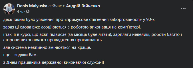 Министр юстиции Денис Малюська поздравил с профессиональным праздником сотрудников Государственной исполнительной службы в четверг, 17 декабря. Об этом он написал на странице в Facebook.