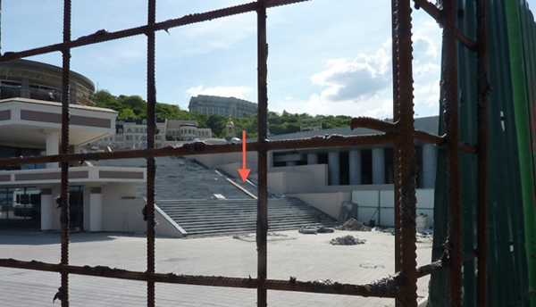 Ще критичне зауваження: Якщо людина з велосипедом, візочком, або на візку захоче з рівня площі потрапити на Набережну, їй пропонується спуститись пандусом, облаштованим на сходах (позначено червоною стрілкою на фото нижче).