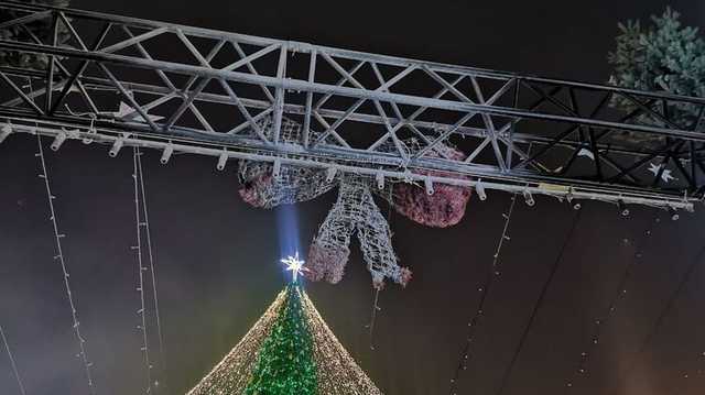 На металлической конструкции прямо над головами людей, которые пришли посмотреть на открытие ёлки, внезапно начался салют. От него загорелся декоративный бант. Его через минуту потушили огнетушителями из ближайшего "домика" с глинтвейном. И ещё оторвалась одна гирлянда в процессе пожара.