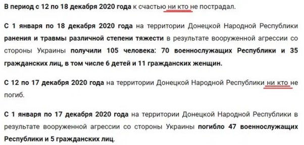 Так называемый омбудсмен квазиобразования ДНР Дарья Морозова заявила, что за период с 12 по 17 декабря в боях с Объединенными силами боевики «республики» не пострадали.