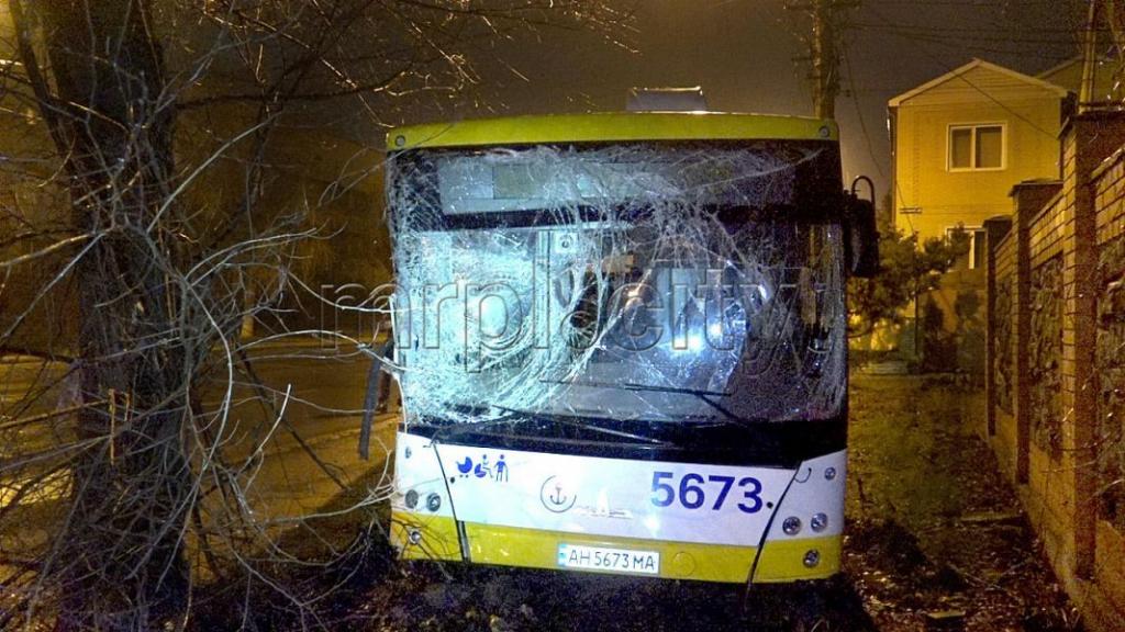 В центре Мариуполя новый коммунальный автобус МАЗ врезался в дерево. В результате столкновения разбились лобовое и боковое стекла, слетела передняя дверь и деформировалась передняя часть.