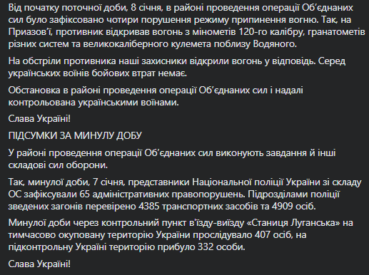С начала текущих суток, 8 января, в районе проведения операции ОС было зафиксировано 4 нарушения режима прекращения огня. На Приазовье, противник открывал огонь из минометов 120-го калибра, гранатометов различных систем и крупнокалиберного пулемета вблизи Водяного.