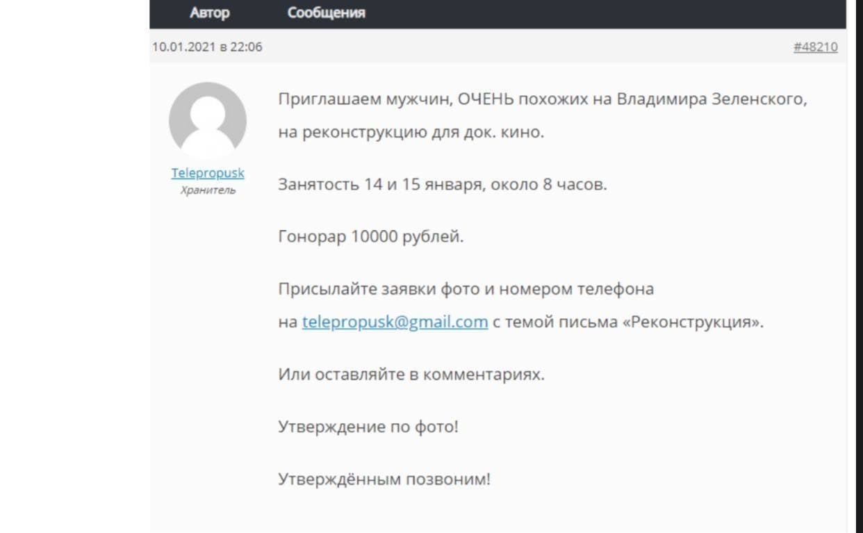 Приводом для таких прогнозів стало повідомлення про пошук чоловіків, максимально схожих на голову української держави. Його розповсюдила російська компанія «Телепропуск» через власний сайт. Формальний привід пошуку двійників українського президента – участь у сценах-реконструкціях для документального кіно. За два дні зйомок (8 годин роботи) обіцяють 10000 рублів.