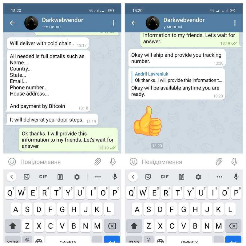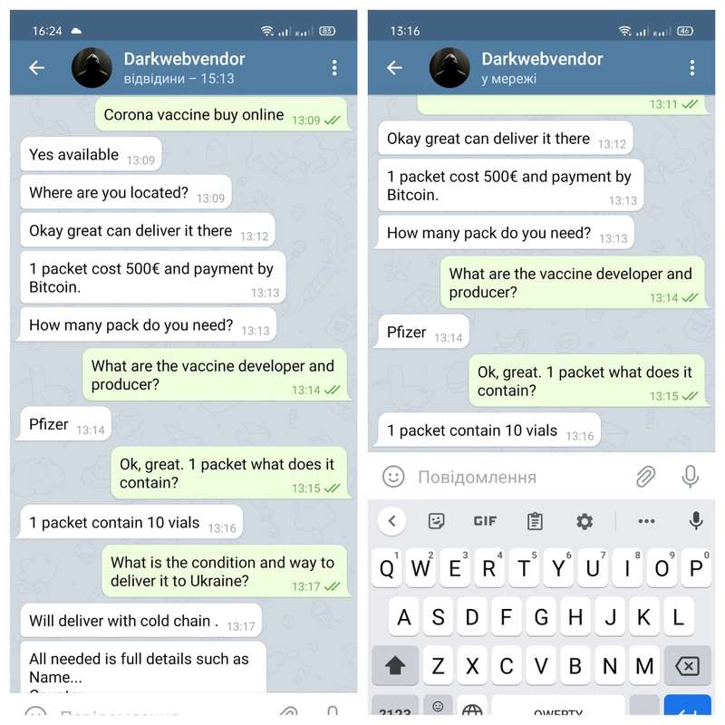 Корреспондент Укринформа вступил в переписку с пользователем мессенджера Telegram с псевдо Darkwebvendor, который отреагировал на запрос на английском «Corona-вакцина, купить онлайн».