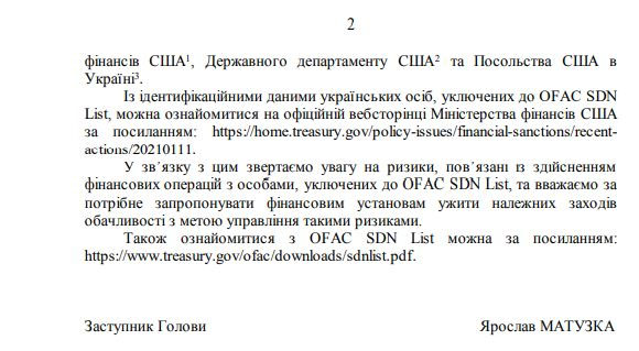 «Обращаем внимание на риски, связанные с осуществлением финансовых операций с лицами, включенными в OFAC SDN List, и считаем нужным предложить финансовым учреждениям принять надлежащие меры предосторожности с целью управления такими рисками», — сказано в письме.