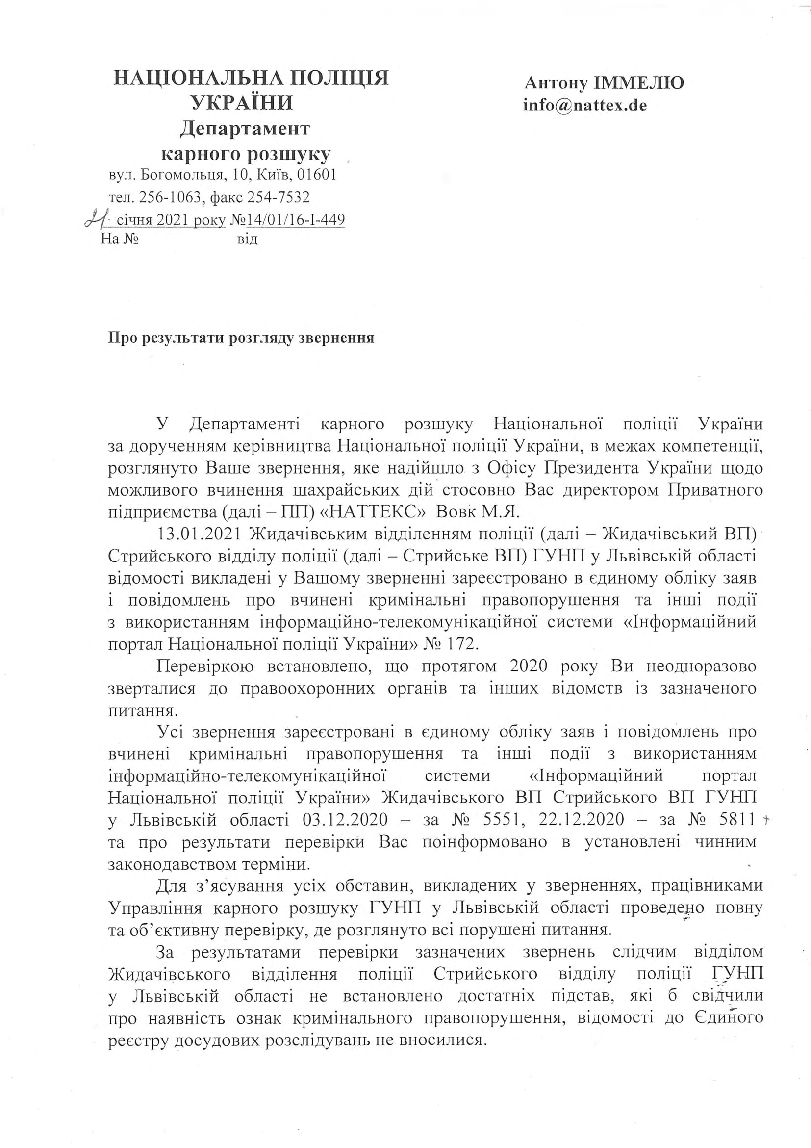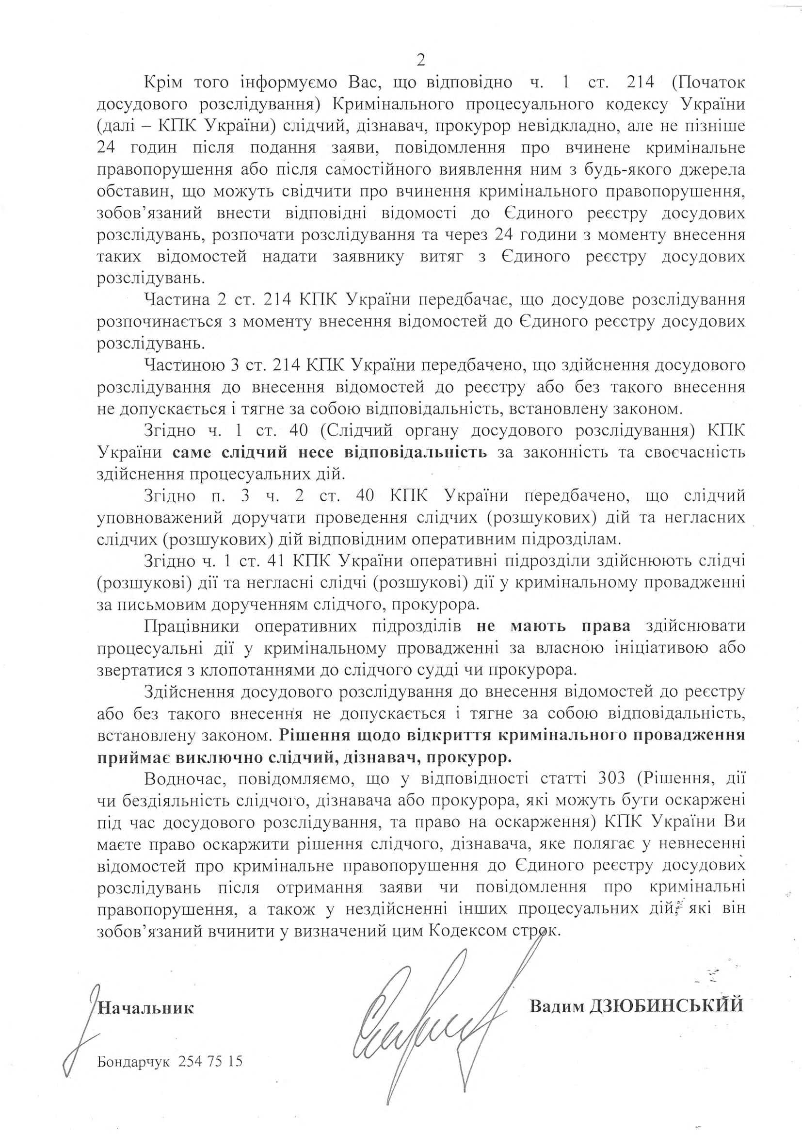 По результатам проверки указанных обращений, следовательским отделом Жидачевского управления полиции Стрийского отделения полиции ГУНП в Львовской области не выявлено достаточных причин, которые бы свидетельствовали про существование признаков криминального правонарушения, ведомости в Единый реестр не вносились...»