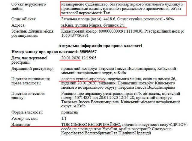 А от згідно з даними Держреєстру речових прав на нерухоме майно, 20 січня 2020 року недобудований багатоповерховий ЖК був проданий, і право власності на цей об’єкт незавершеного будівництва отримала фейкова «лондонська» компанія Simex Enterprises.