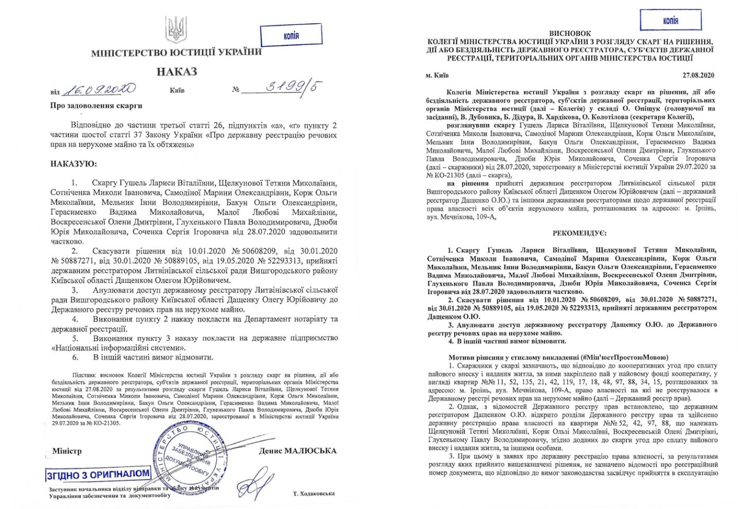 Під час розгляду скарги колегія встановила, що приміщення, на яке претендує скаржник, у липні 2020 було переписано з ТОВ «Мінтінай» на ТОВ «АБВ нерухомість». Зробив це уже інший реєстратор – Пірнівської сільської ради Вишгородського району Київської області – Олексій Одрихівський.