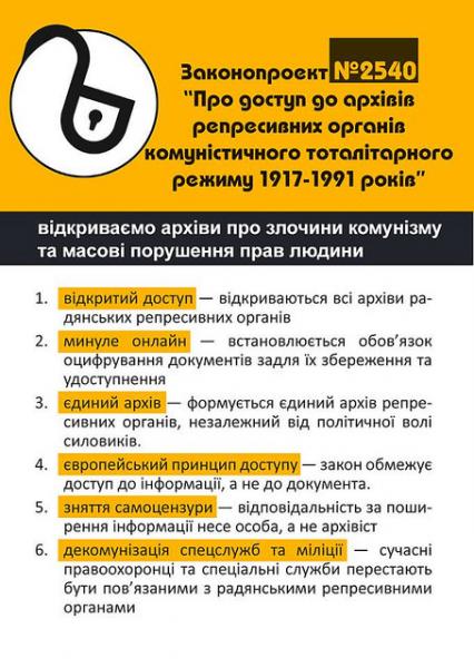 9 апреля Верховная Рада Украины приняла пакет из 4-х антикоммунистических законов. Одним из них является Закон Украины «О доступе к архивам репрессивных органов коммунистического тоталитарного режима 1917-1991 годов». Среди экспертов по доступу к архивам и архивистов возникла дискуссия относительно целесообразности его принятия.