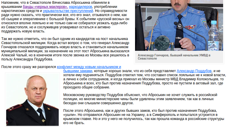 Оказывается, Аброськин претендовал на пост главмента в Севастополе при новой, российской, власти. На эту должность его хотел поставить севастопольский Захарченко - Чалый. Но приехавший из Москвы министр МВД Колокольцев кандидатуру Аброськина зарубил, утвердив своего человека.