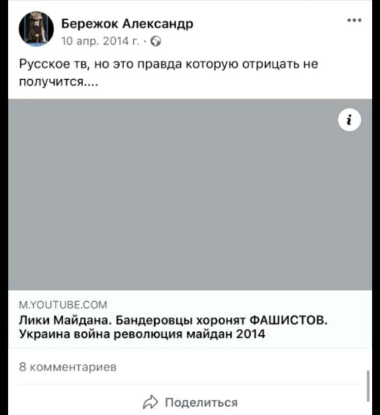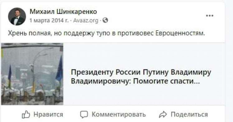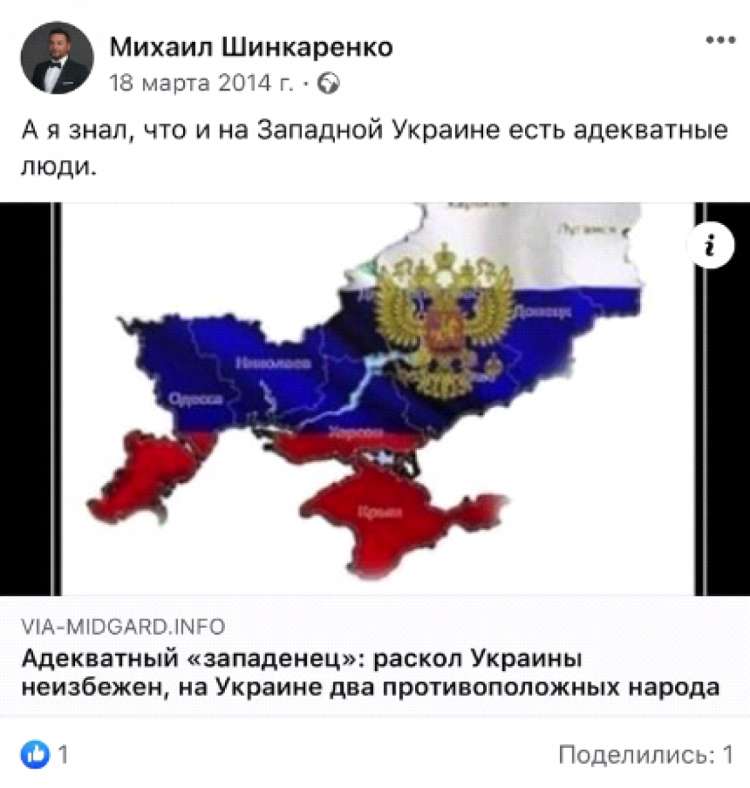 Ещё более шокирующая публикация с его стены в Facebook – материал о "неизбежном расколе Украины на два противоположных народа", что Шинкаренко счёл "адекватным прогнозом".
