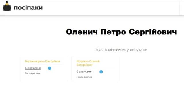На этом сотрудничество с нардепами из «Партии регионов» не закончилось. С 2007 по 2012 годы Петр Оленич был помощником-консультантом на платной основе народного депутата Украины VI созыва от «Партии регионов» Ирины Бережной по №169 округу в Харьковской обл.
