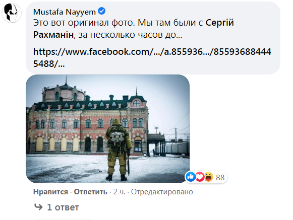 Мустафа Найем так прокомментировал информацию: «Это вот оригинал фото. Мы там были с Сергеем Рахманиным, за несколько часов до..». Он выложил снимок, который действительно аналогичен изображению на памятнике боевикам «ДНР».