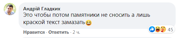 Один из пользователей отметил в комментарии: «Это чтобы потом памятники не сносить, а лишь краской текст замазать».