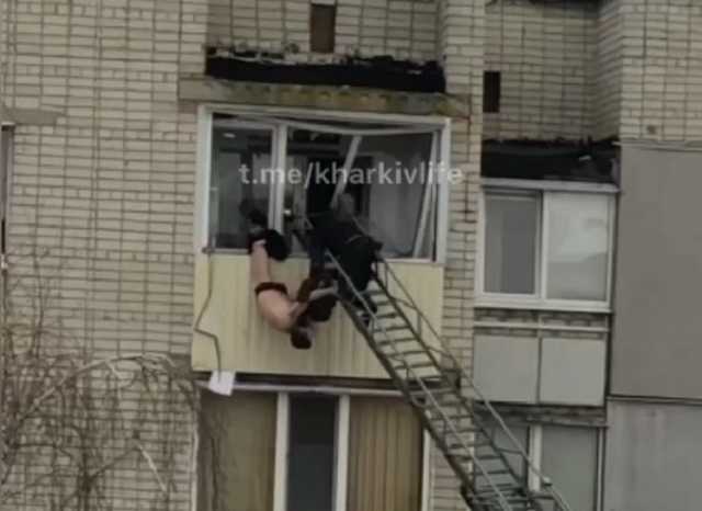 Очевидцы запечатлели, как мужчина висит вниз головой на балконе, и его удерживает спасатель.