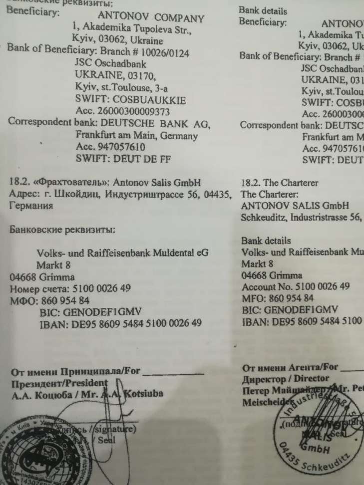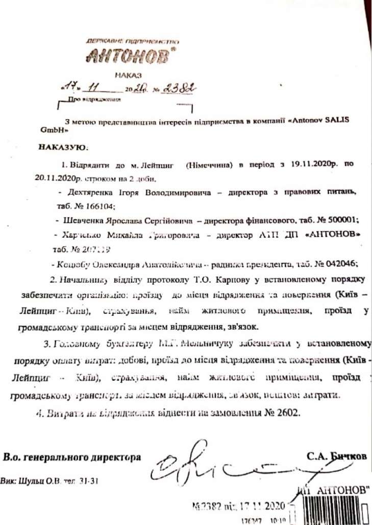 Напомним, что в ноябре 2020 года уголовной полицией Германии в аэропорту Лейпцига были задержаны с поддельными удостоверениями членов экипажа воздушного судна должностные лица ГП «Антонов» Коцюба, Дехтяренко, Шевченко, Харченко и адвокат юридической фирмы «Илляшев и партнеры» Марченко, в отношении которых в Германии возбуждено уголовное дело № KIW098/20 согласно параграфа 271 Уголовного кодекса ФРГ в связи с неправдивым документальным подтверждением. Поддельные удостоверения были изъяты полицией, а «члены экипажа» были отправлены на Родину. В Украине национальной полицией по указанному факту сразу же было возбуждено уголовное дело по ст. 366 УК Украины, поскольку скандал «замять» не удалось. Возникает вопрос – кто принял решение отправить этих граждан под видом членов экипажа в Германию? Ответ: исполняющий обязанности генерального директора Бычков С.А.
