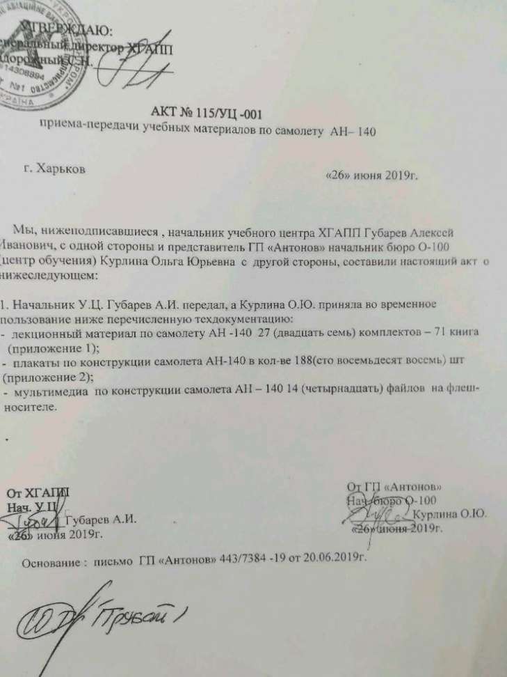 Итак, под конец 2018 года главный инженер Бычков и директор по кадровым вопросам ГП «Антонов» Маевский решили «приобрести» у Харьковского государственного авиационного производственного предприятия (ХГАПП) методические рекомендации по самолету АН-140 (то есть купить 188 плакатов по цене 4,6 млн. грн.!!!), который серийно не выпускается, и конструкторская документация на который хранится на ГП «Антонов».