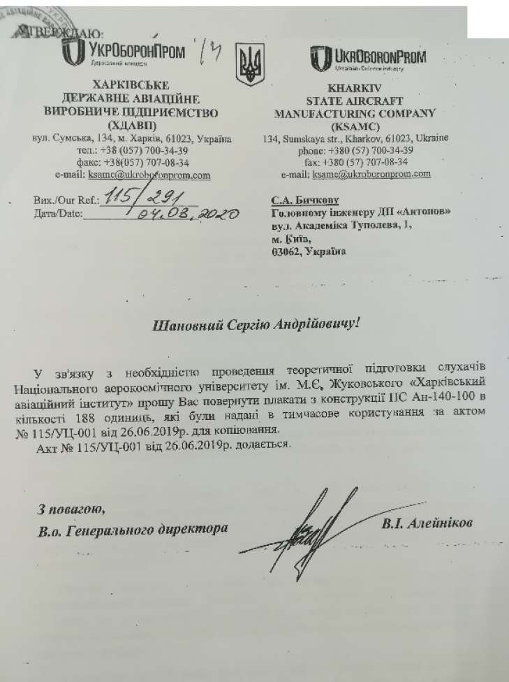 В марте 2020 года руководитель ХГАПП письменно обращается к главному инженеру Бычкову срочно вернуть плакаты по АН-140 в количестве 188 штук, которые вышеуказанным актом были переданы во временное пользование.