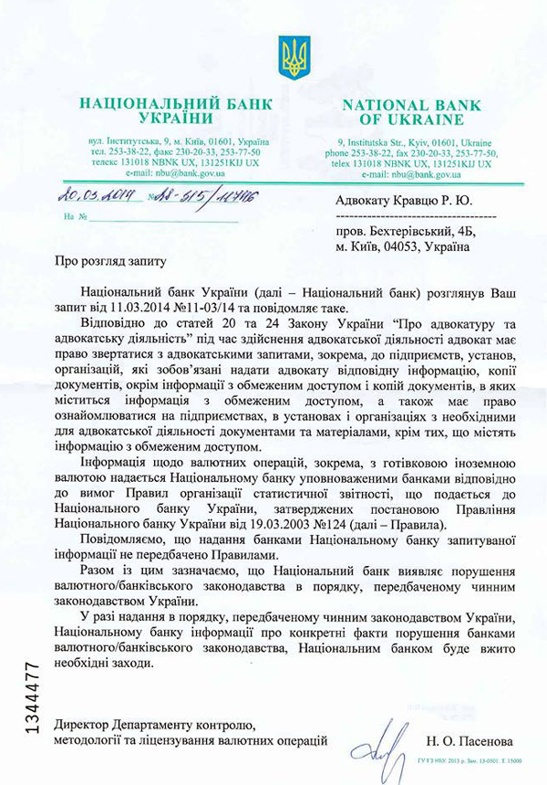 В Нацбанке адвокату ответили стандартной отпиской. Скорее всего, ответ был составлен роботами.