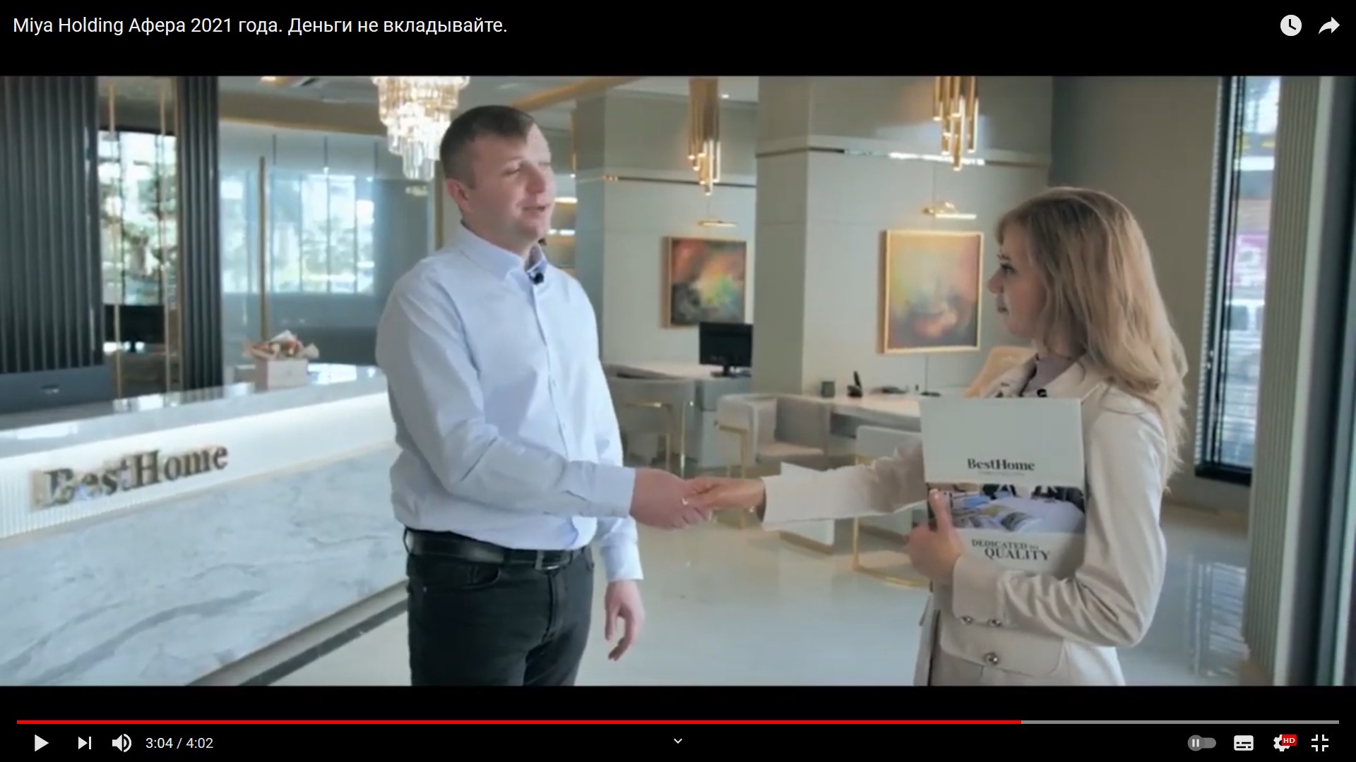 По заверениям организаторов финансовой пирамиды Мия Холдинг товарищ Александров мега успешный супер богатый бизнесмен с международным именем. Мы на всякий случай проверили списки Форбс, как думаете на каком месте там некто Сергей Анатольевич Александров? На всякий случай мы спросили у Гугла, чем же занимается этот успешный бизнесмен. Гугл как и Форбс не нашелся с ответом. Осталось спросить у ясеня… Или у правоохранителей, которые успели ознакомиться с деятельностью данного персонажа и даже завести уголовное дело по статье мошенничество, за которую дают от 5 до 12 лет пребывания в исправительной колонии с конфискацией имущества. Обещанная наивным инвесторам сеть магазинов электронной техники с повышенным кешбеком на деле выглядит как маленький захудалый магазинчик с несколькими полками электроники по значительно завышенным ценам. И много видео с вымышленными героями, как, например, некто Наталья – якобы представитель турецкого застройщика Best Home.