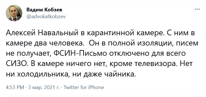 Адвокат Навального Вадим Кобзев уточнил, что его клиент пребывает в полной изоляции — не получает писем («ФСИН-Письмо» отключено для всего СИЗО), и даже не может пользоваться тюремным «ларьком». На его вопрос о причинах последнего юристу ответили, что «бухгалтерия не видит деньги на счете».