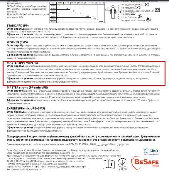Да и по телефону менеджеры по продажам этой компании подтверждают: сертификат ГСТУ EN 14126:2008 на модель защитного комбинезона BeSafe Pro Master (PP + microPE) компания не получала.