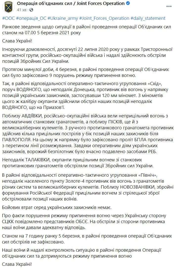 "Боевых потерь среди украинских защитников нет. О фактах нарушения режима прекращения огня через украинскую сторону СЦКК сообщено представителей ОБСЕ. На обстрелы со стороны противника наши воины давали адекватный ответ", – отмечают военные. В штабе ООС добавили, что по состоянию на утро 5 марта в районе проведения операции Объединенных сил обстрелов не зафиксировано.