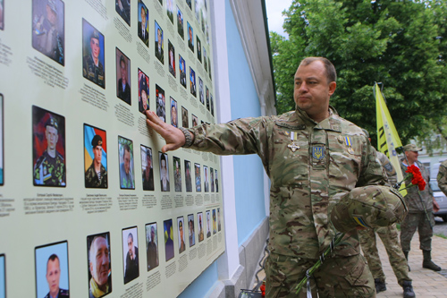 Боєць АТО торкається до Стіни пам’яті загиблих за єдність України із фотографіями на території Михайлівського Золотоверхого монастиря