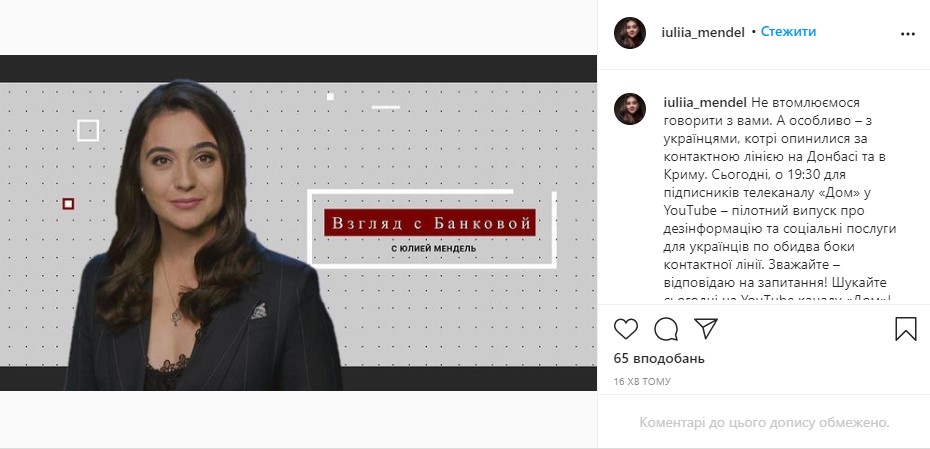 "Не устаем говорить с вами. А особенно-с украинцами, которые оказались за контактной линией на Донбассе и в Крыму. Сегодня, в 19:30 для подписчиков телеканала "Дом" в YouTube – пилотный выпуск о дезинформации и социальных услугах для украинцев по обе стороны контактной линии. Считайте - отвечаю на вопросы! Ищите сегодня на YouTube канала "Дом", - написала она в Инстаграме.