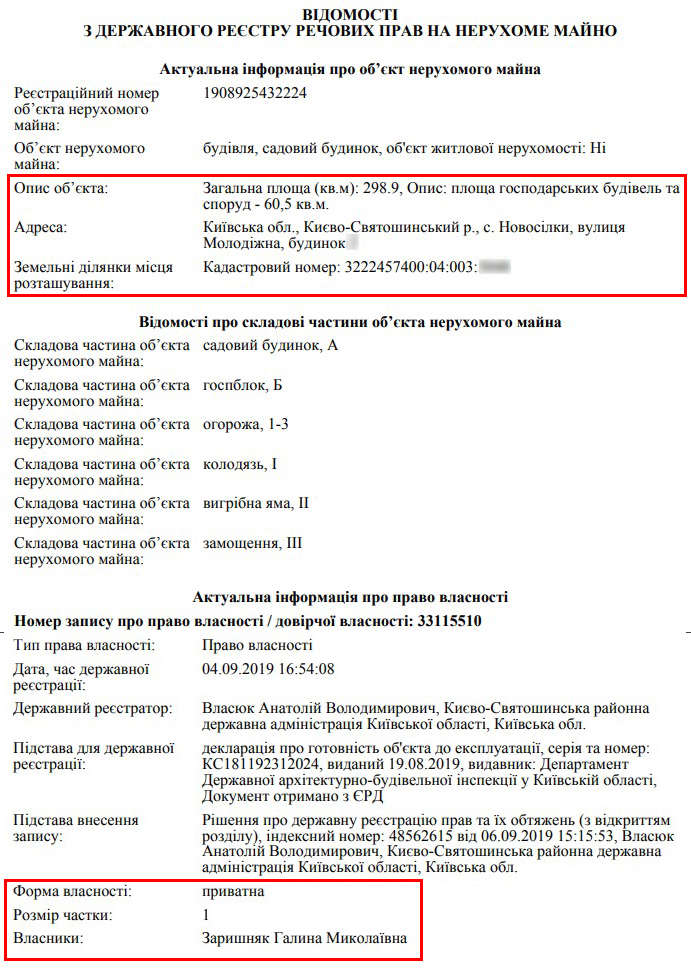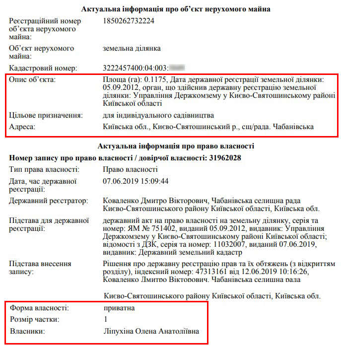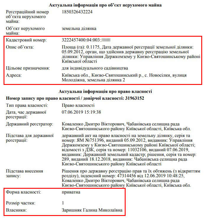 Також у 2012 році Олена Анатоліївна приватизувала ділянку площею 0,11 га під Києвом для садівництва, поряд зі збудованим маєтком, який ми показували вище.
