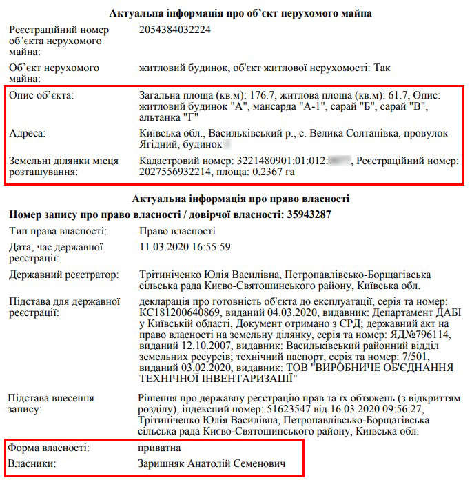 На одній із вільних ділянок у Васильківському районі вирішив побудуватися й чоловік Анатолій Заришняк. Так, незадовго до весняного карантину він зареєстрував право власності на помешкання площею 176 квадратних метрів у селі Велика Солтанівка.