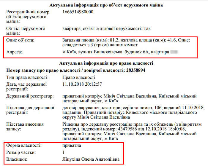 Дочка подружжя – Олена Ліпухіна подавала декларацію помічниці судді Верховного суду. Раніше їй подарували квартиру площею понад 80 кв. м по вулиці Вишняківській у Києві. За житло подібної площі в цьому будинку просять 50 тисяч доларів.
