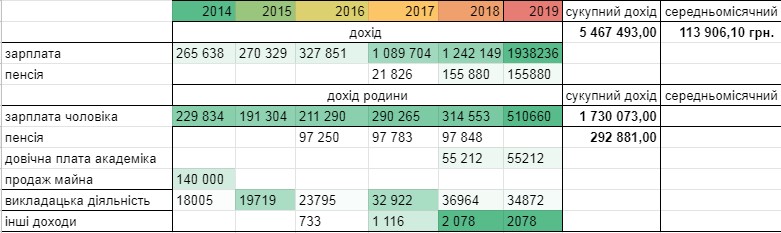 Чоловік Анатолій працює академіком у Національній академії аграрних наук. За весь 2019 рік ця посада принесла йому понад пів мільйона гривень доходу. Не рахуючи пенсію та викладацьку діяльність. У 2014-му одноразово продав майно за допорогові 140 тисяч гривень.