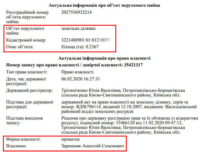 У той самий день, що і суддя, 0,23 гектари отримав і Анатолій Заришняк на підставі державного акта від 2007 року. Із призначенням для будівництва та обслуговування житлового будинку. Інформація про інші землі, на жаль, відсутня.