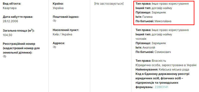 Також, відповідно до реєстру, суддя Заришняк має пів квартири в Білій Церкві, що на Київщині. Йдеться про спадкові 52 кв. м, які не відображені в декларації за 2019 рік. Друга половина перебуває у власності сестри Ніни Коршун, яка теж була суддею, але склала повноваження.